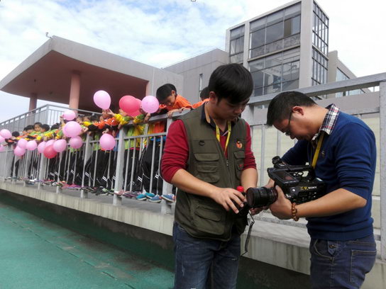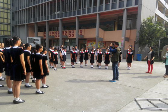 学校老师积极配合我们的工作,帮助我们整理合唱团队形,非常认真的和导演交流队形排列和表现。