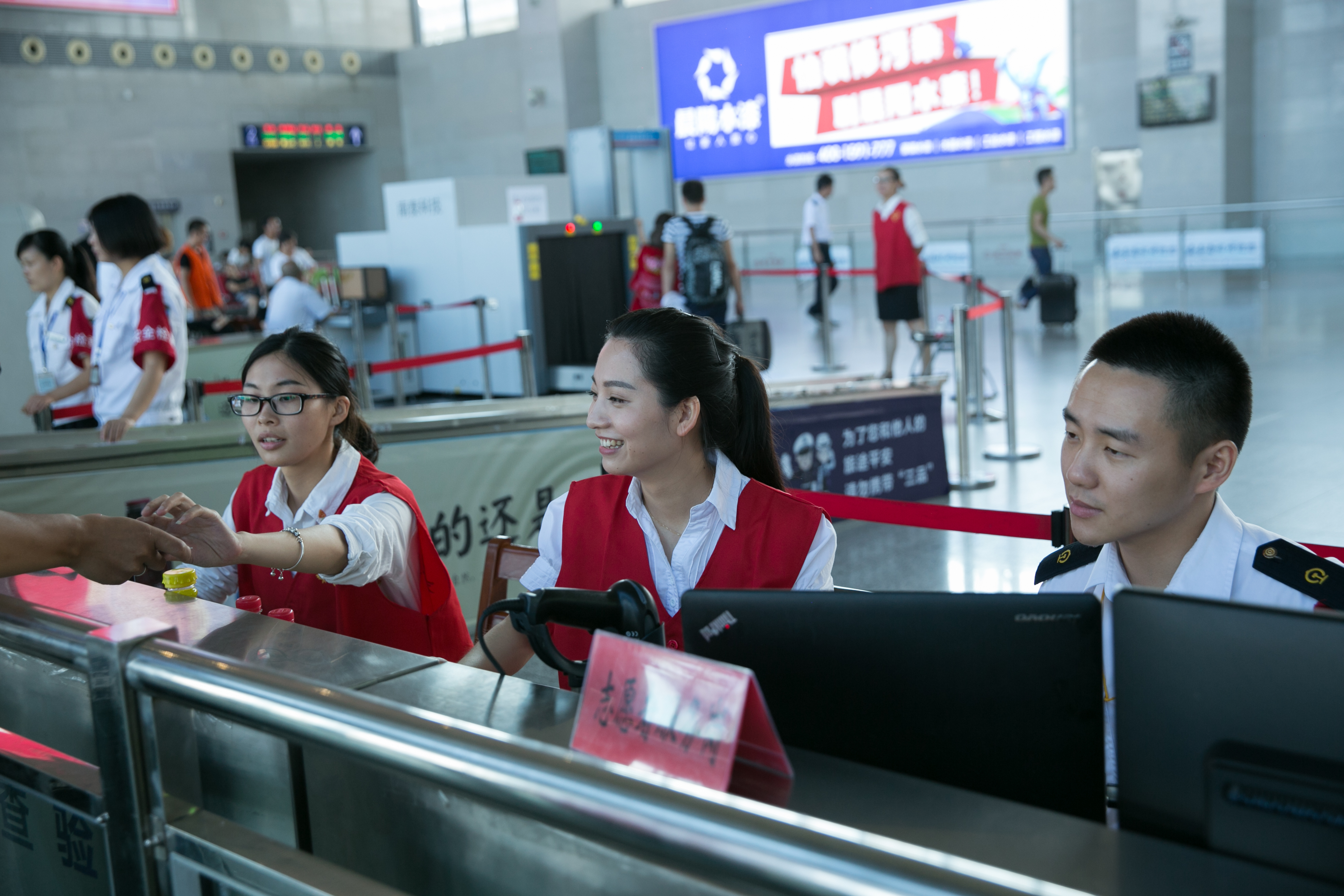在候站大厅里随处可见志愿者们忙碌的身影,协助工作人员核对身份证、车票信息,帮助乘客拿行李、指路、过安检,大伙儿忙得不亦乐乎。从8月3日至9月8日,每天5个人服务3小时,一共持续10天,志愿服务人员达50人次。虽然每次参与的都是不同人员,但我们的志愿者们个个精神抖索、微笑服务,用自己辛劳的汗水,为平安嘉善建设献出了自己的贡献。